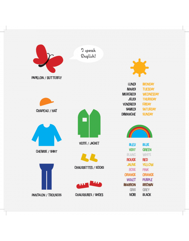 Cet album bilingue anglais et allemand est construit comme une ritournelle. Il s’amuse des clichés et des apparences et invite à se questionner sur l’identité. Les enfants se familiarisent avec le vocabulaire des jours, des vêtements, des couleurs, des métiers, des animaux ou de personnages bien connus.