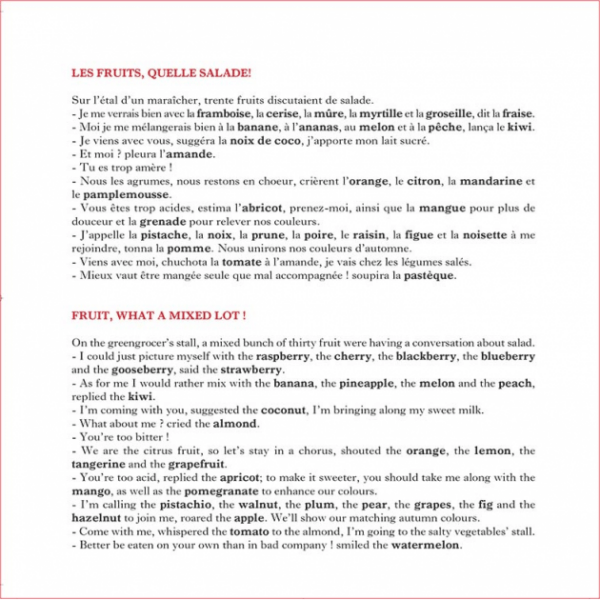 Trente fruits discutent entre eux. Comment vont-ils se mélanger pour composer la plus belle salade? La partie imagée est précédée d’une partie texte en 10 langues, ce qui permet d’observer comment les mots de l’imagier se comportent dans une phrase. Le texte est un support utile pour les personnes allophones qui découvrent le français. Bien que conçu pour les enfants, cet imagier est aussi utilisé dans les cours de FLE pour adultes.